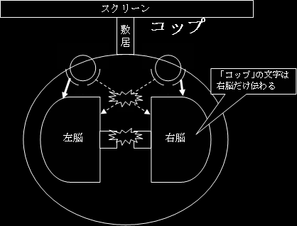 したがって、上図の実験の場合、右目でみた「コップ」という文字の情報は、「