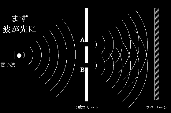 1個の粒子が、観測されていないとき、波のような状態になって、スリットA、スリットBを同時に通り抜ける」
