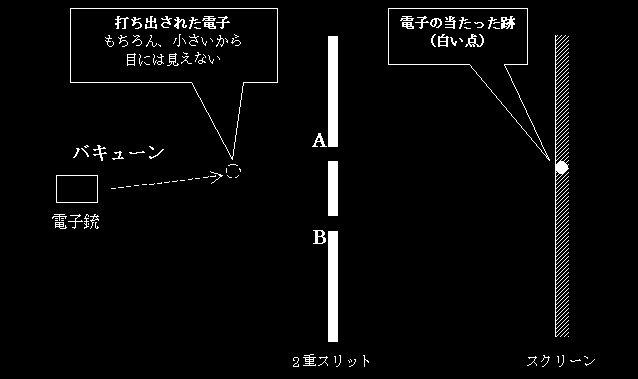 これは、電子1個を飛ばしたのだから、スクリーン上には、その1個が当たった場所が「点」として映るということで、当たり前の話である。なんの不思議もない。