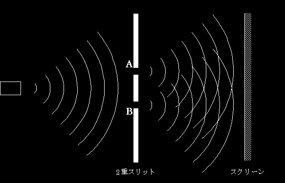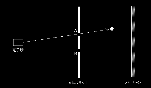 (パチンコの玉を想像して欲しい。パチンコの玉が、このボードを越えてスクリーンにたどり着くためには、スリットAかスリットBのどちらかを通り抜けなくてはならない。重要なのは、パチンコの玉(粒子)は、あくまで一方のスリットしか通らないということだ。1個のパチンコの玉が、両方のスリットを通り抜けるということはありえない。