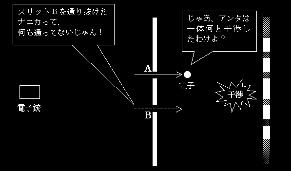 スリットBからは何も出てこないのだから、スリットAを通り抜けた電子1個は、干渉しようがないではないか!
